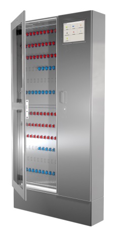 Elektronisches Schlüsselverwaltungssystem für die optimale Schlüsselkontrolle. Jeder Schlüssel wird an einem Schlüsselträger befestigt und elektromechanisch im System verriegelt. Mastersystem mit kompletter Systemsteuerung, Datenbank und weitreichender Funktionalität: