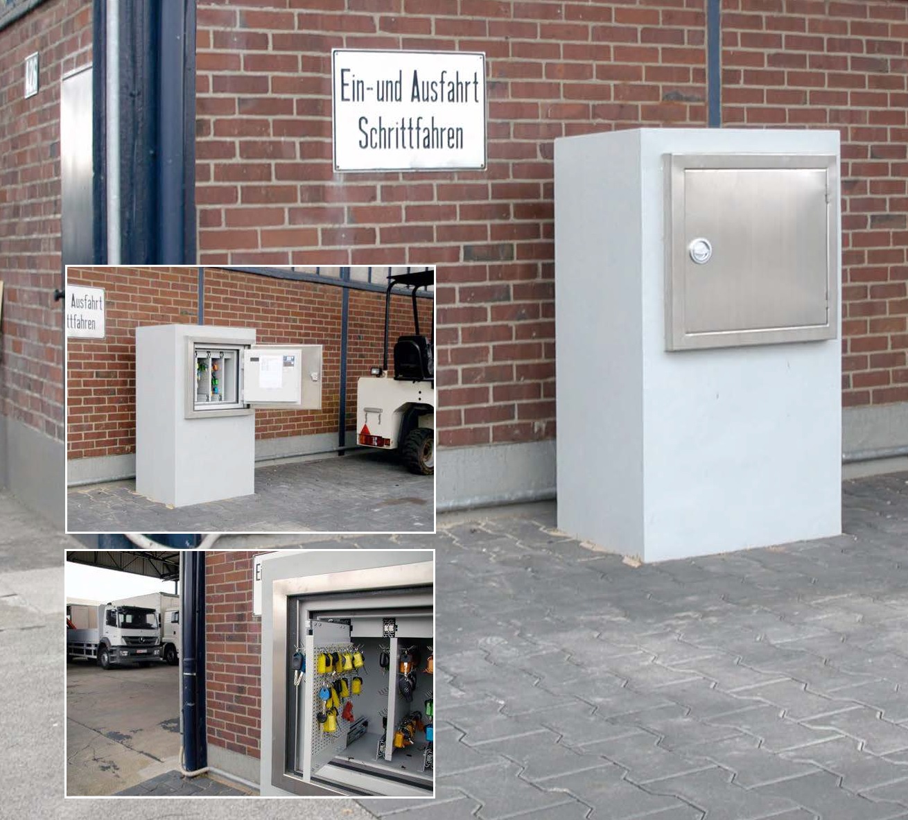 Für raue Umgebungen bieten sich unsere hochwertigen Schlüsseltresore mit Betonummantelung zur Aufstellung im Freigelände an. Die Schlüsseltresor Lösungen ermöglichen somit eine sichere Aufbewahrung von Fahrzeugschlüsseln auch im Außenbereich. Der Tresor der individuell in Höhe, Breite und Tiefe gefertigt werden kann, wird dazu rundherum mit einer Ummantelung aus Spezialbeton versehen und ggf. mit der Bodenplatte verankert. Einen sauberen Abschluß bietet die Edelstahl Fronttür. Auch die Sicherheitsstufe kann als Standard Version wie aber auch als versicherungskonforme Widerstandsklasse frei ausgewählt werden. Darüber hinaus kann der Kunde wählen, ob der Tresor über ein Doppelbart Sicherheitsschloss verfügen soll oder über eine Code Tastatur. Beschriftungen runden das Portfolio ab.